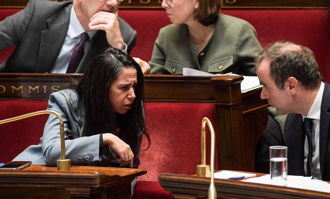 Naima Moutchou (ministre des Outre-mer) et Sébastien Lecornu (Premier ministre) à l’Assemblée nationale lors de la déclaration de politique générale de Sébastien Lecornu le 14 octobre 2025. Photo : Isa Harsin / Sipa