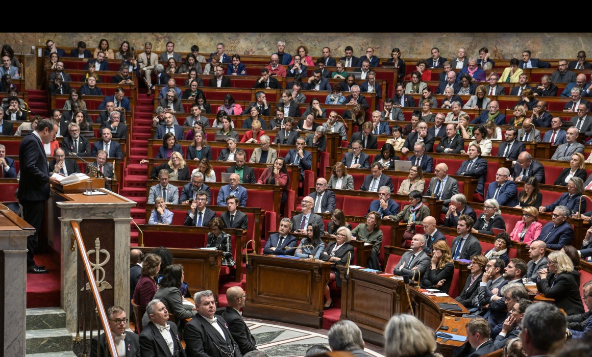 Le Premier ministre Sébastien Lecornu prononce son discours de déclaration de politique générale, mardi 14 octobre 2025 devant les députés et les nouveaux ministres à l’Assemblée nationale à Paris. Photo : Isa Harsin / Sipa