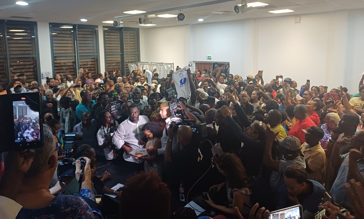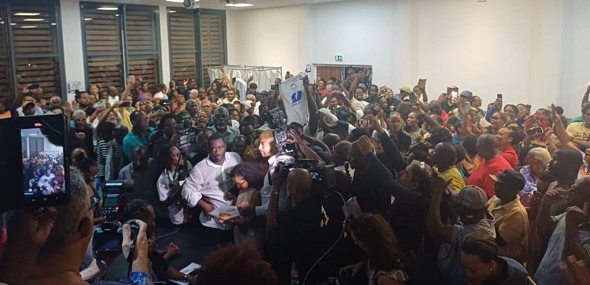À 21h20, les cris de joie éclatent au bureau centralisateur de Baie-Mahault où sont proclamés les résultats qui annoncent Michel Mado vainqueur de l’élection municipales. Photo : Le Courrier de Guadeloupe
